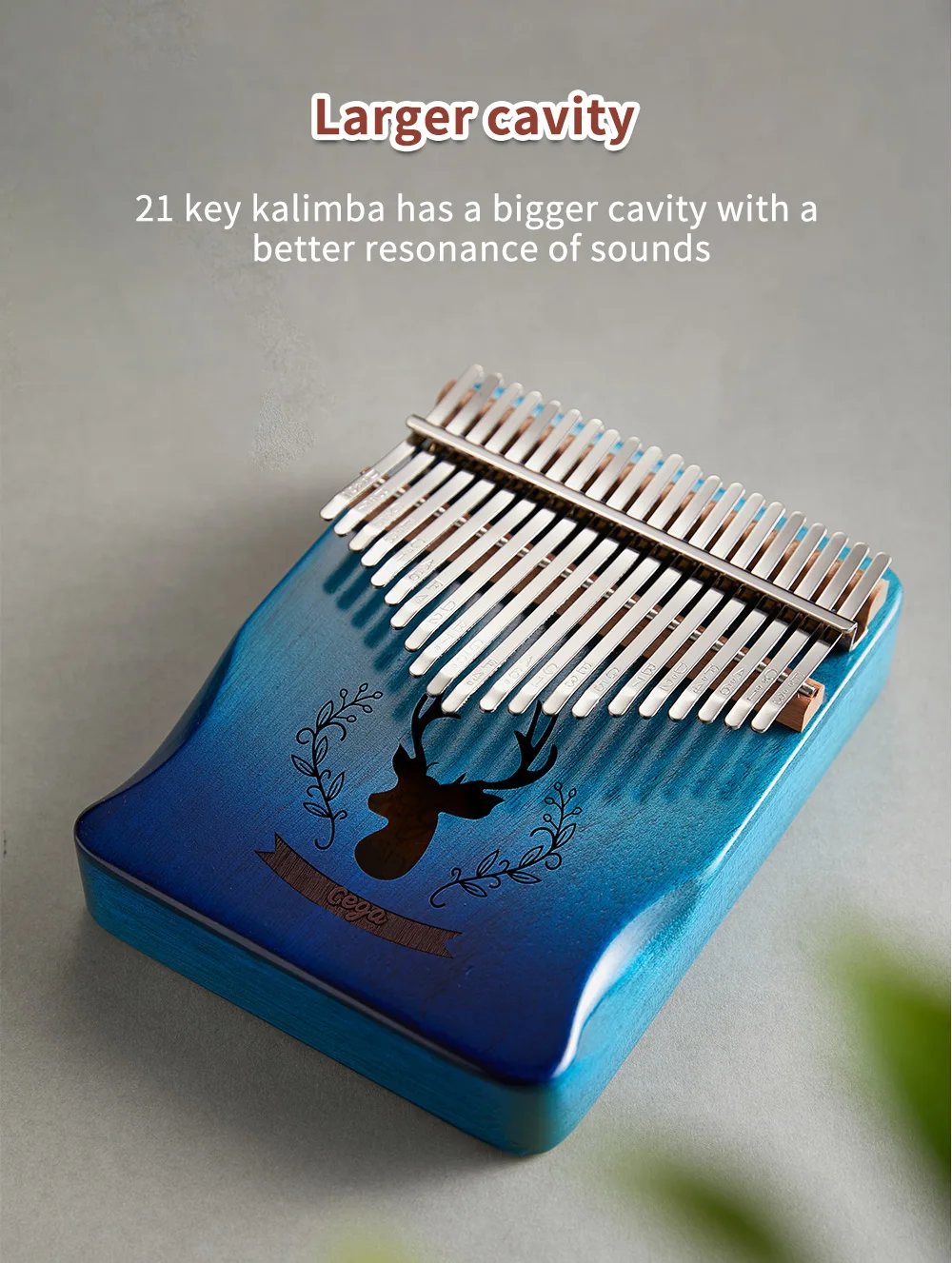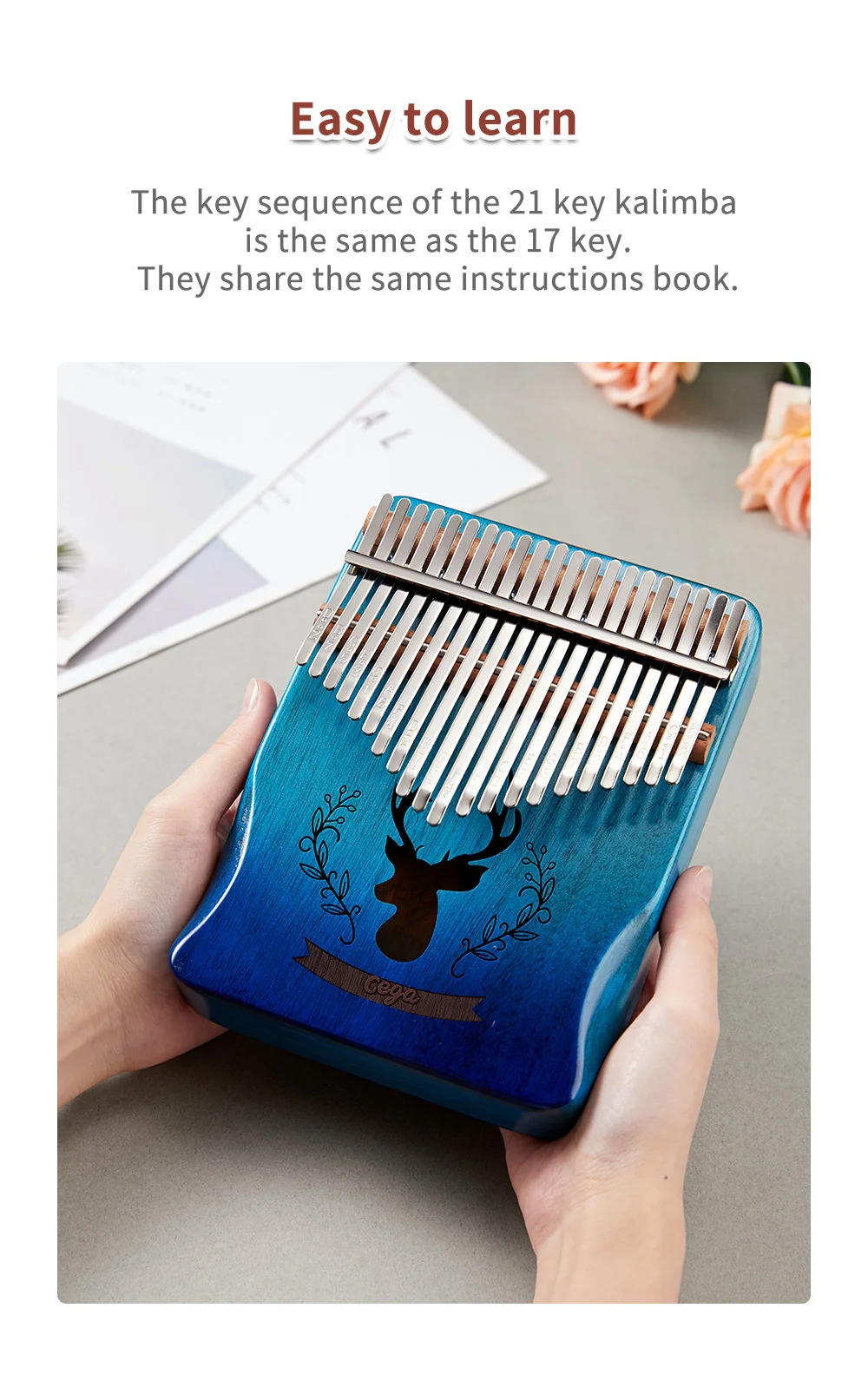The 21 key kalimba feels good, and has a nice sound. It's fun with the play and is in my opinion very soothing. I am happy and satisfied with this purchase.