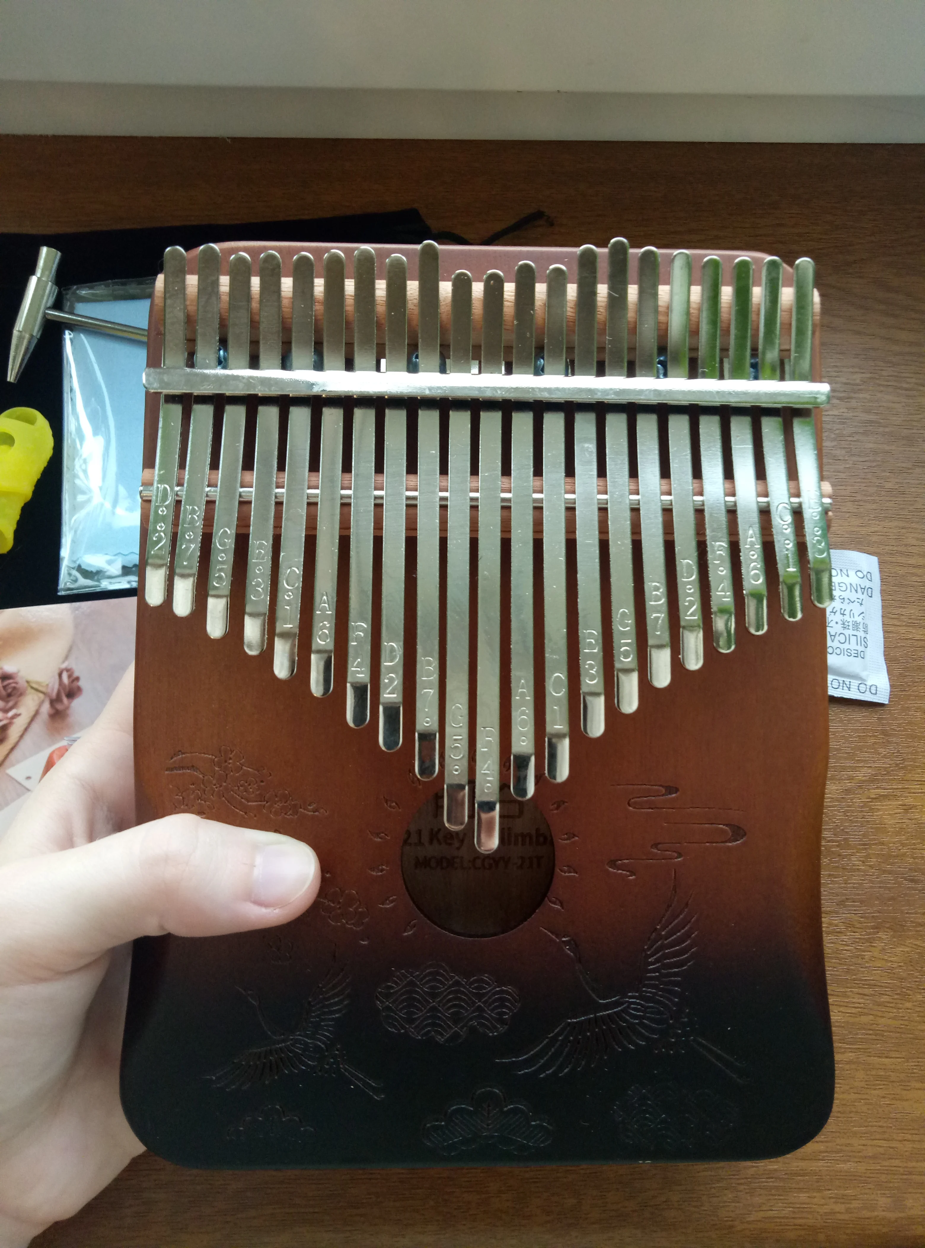 Kalimba is beautiful. Goes without a adjusting hammer. Very light, pleasant to hold, no smell. Sounds great. Really love it!