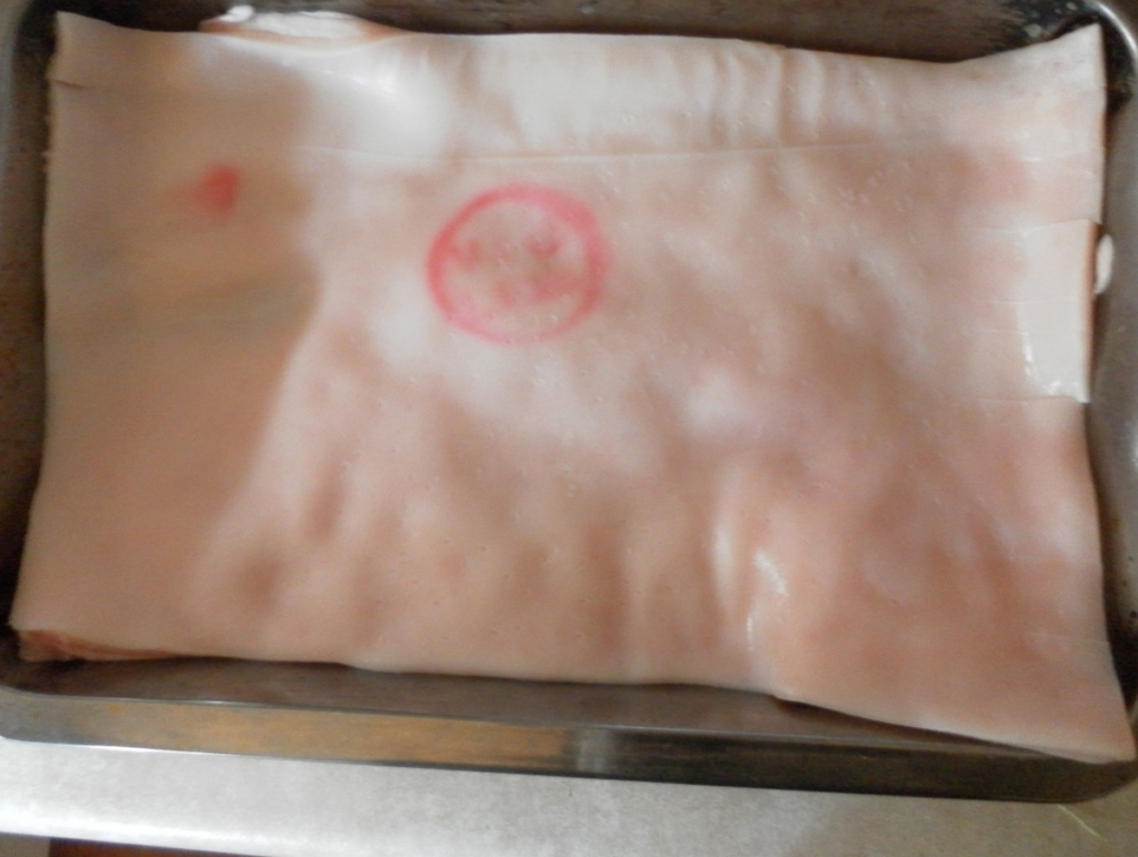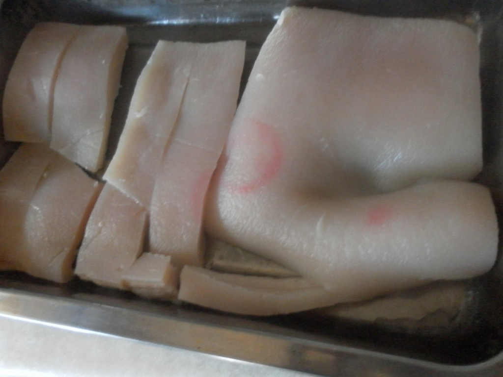 When you have bought the pork rind, give it a good scrub on the surface of the skin. If there are some meat or fat under the skin, you can leave them there. I prefer to cut away the meat and fat under the skin. Only the skin will give the most crunch. The meat and fat will not be as crunchy.