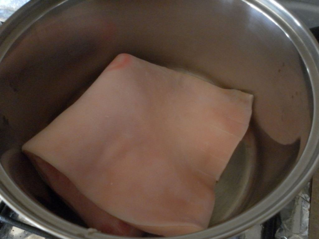 Boil the pork rind for 30 minutes. The skin will softened and look a little translucent.