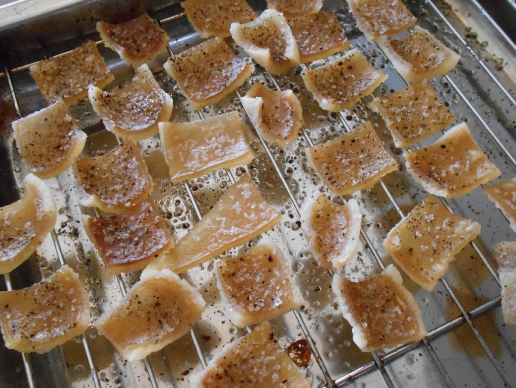 The rind pieces are ready to be deep fried when they look dry and are smaller in size.