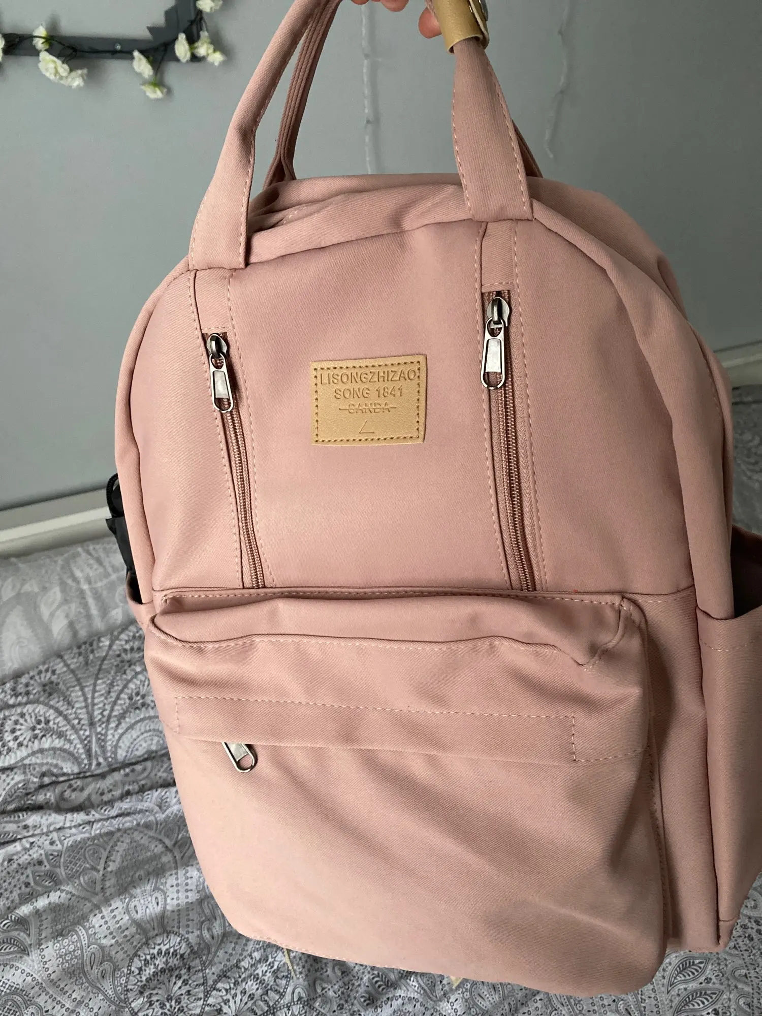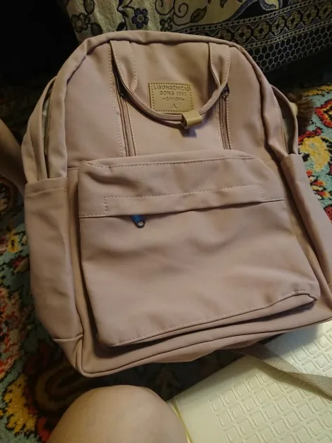 Backpack of very good quality, nice material. Has many pockets, comfortable to wear. Came pretty fast