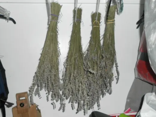 The flowers are harvested by cutting about 30 cm of the flower stem from the plant. Cut off enough stems to make a bunch. Tie the end of the stems together with a string or elastic band. Hang the bunch of lavender flowers upside down in a dry, dust-free, and dark place, like a ventilated closet. Leave the flowers to dry for several weeks. The process of drying preserves the lavender flowers.