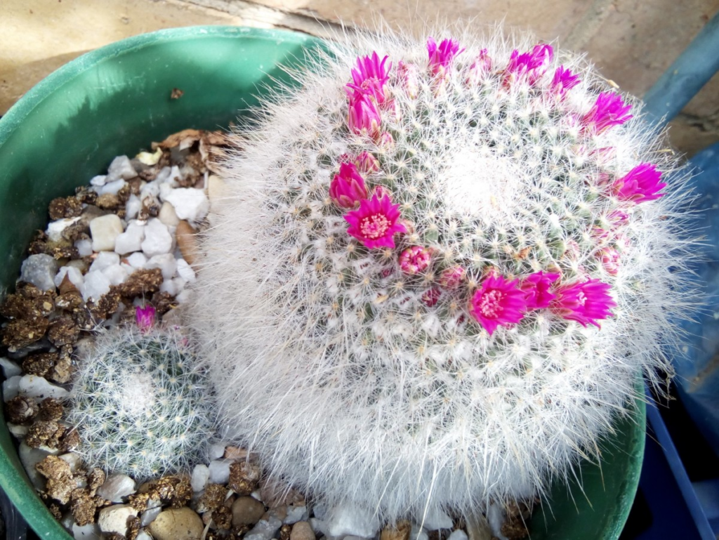 Old Lady Cactus, a.k.a Mammillaria Hahniana, has a baby offset and carries a ring of small flowers around the top of her head. Photo by lady rain