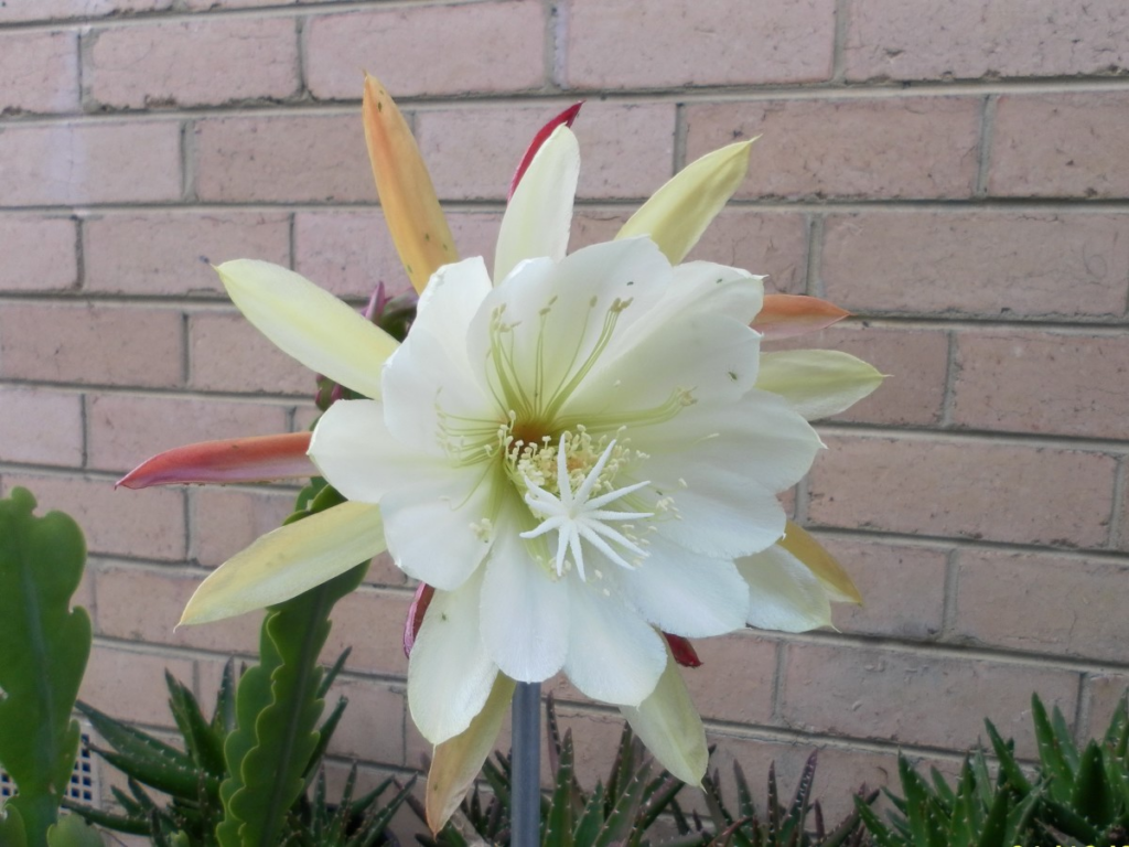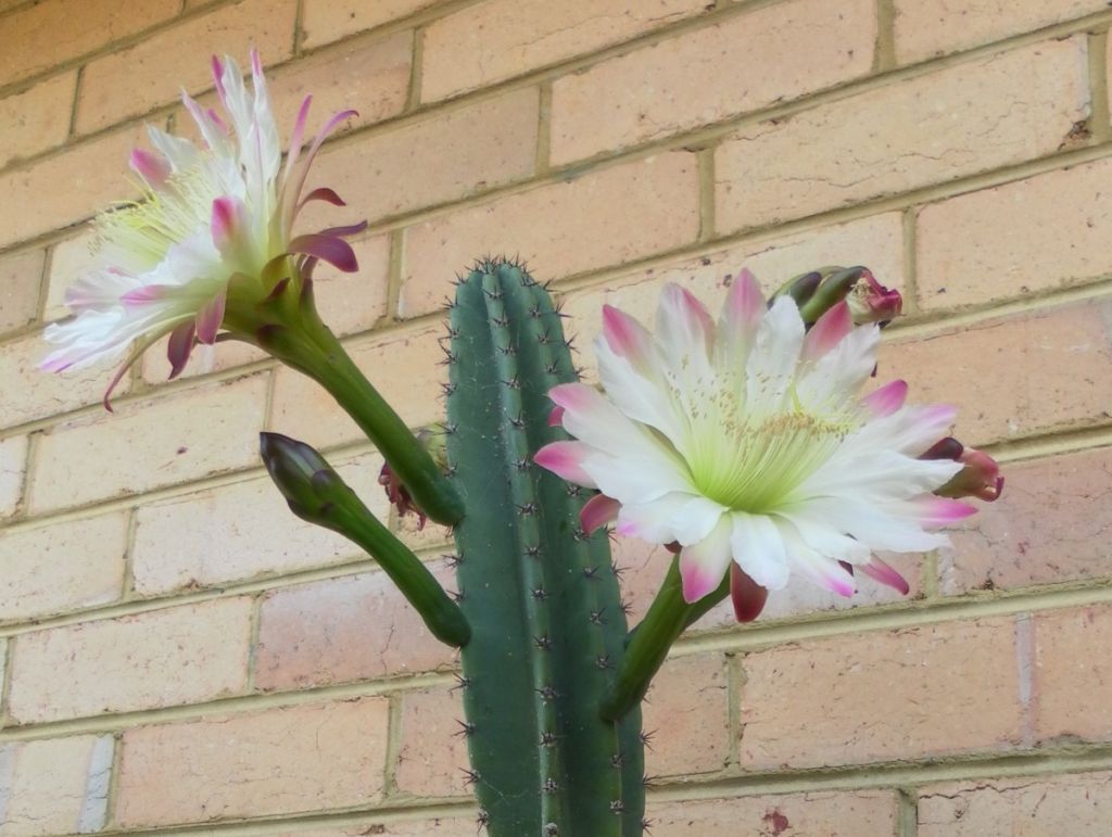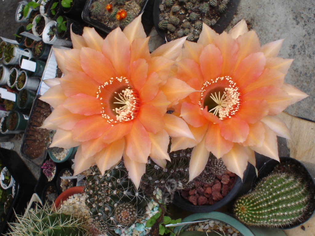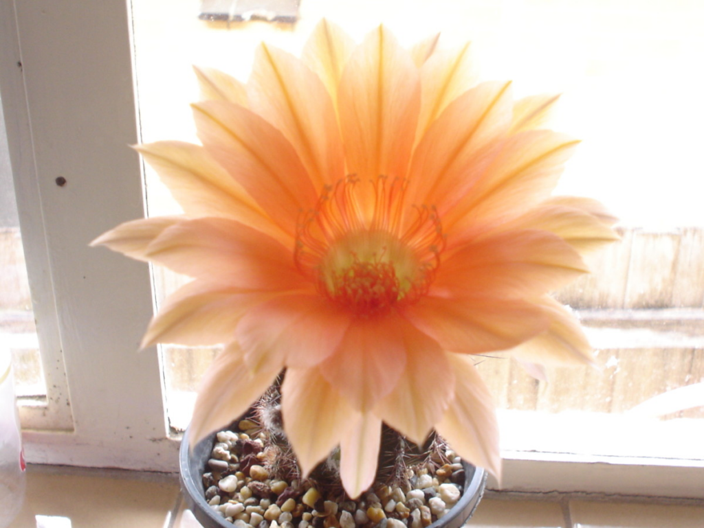 Echinopsis cactus bearing apricot-colored flowers after three years of planting. Photos by lady rain