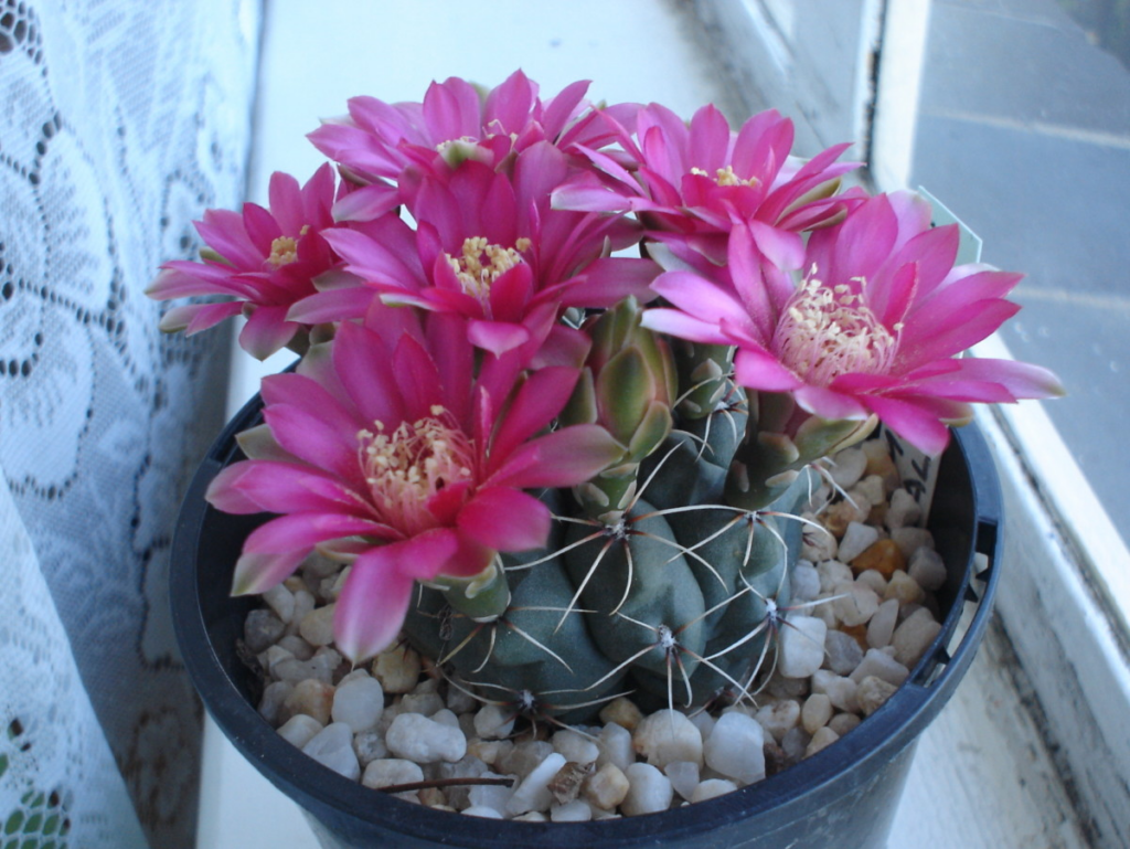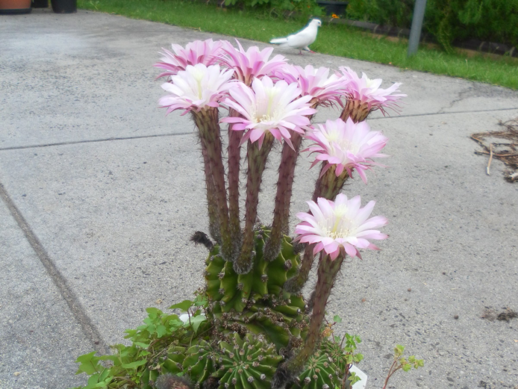 Echinopsis with a display of flower in spring. My beloved Birdie in the background. Photo by lady rainCacti grow well on a sunny window sill and will flower when the temperature and soil conditions are right. Photo by lady rain
