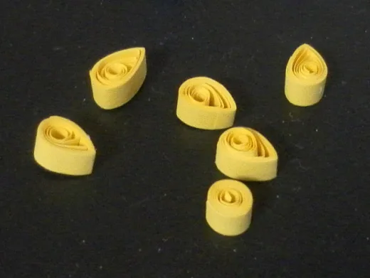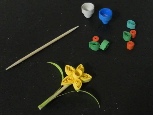 To create a miniature daffodil flower, make five yellow teardrop coils and one small tight coil. Push the centre of the small coil outwards. Arrange the teardrop coils around the small coil to form the shape of a flower. Gently glue the teardrop coils to the small coil.