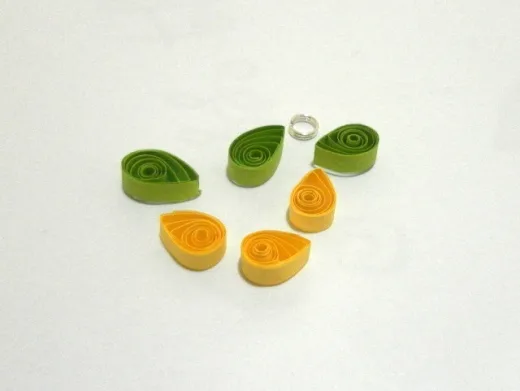 Make six closed coils with blue and red quilling paper strips. Shape each coil to form a teardrop shape.