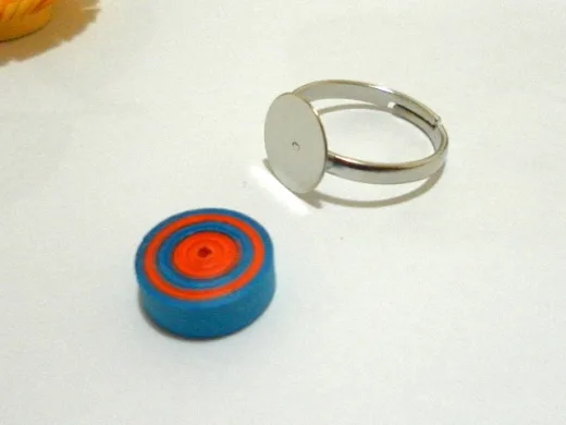 Join the five strips of quilling paper together to form a very long strip and then make a tight coil. The coil should have a diameter of about 12mm. Give the coil a coat of varnish and leave to dry. Glue the coil to the metal pad of the ring and let the glue dry thoroughly before wearing the ring.