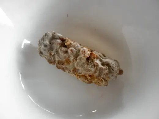 When there is enough grey or black stuff on the piece of tempeh, remove it from the incubator and cut it into thin slices or very small chunks. Leave the chunks to air dry for a couple of days. Blend the dry chunks with double the amount of rice flour until they are in powder form.