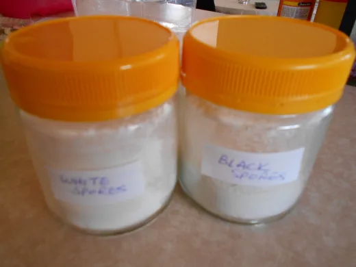 Black or white? Both jars have enough spores to make several kilos of homemade tempeh.