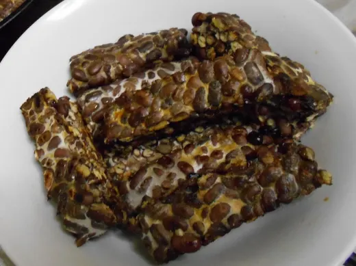 Tempeh is made from fermented soybeans. It originated in Indonesia, where soy is a staple source of protein for the people and where the consumption of meat is considered a luxury. It is a popular vegan food as a substitute for meat and is gluten-free.