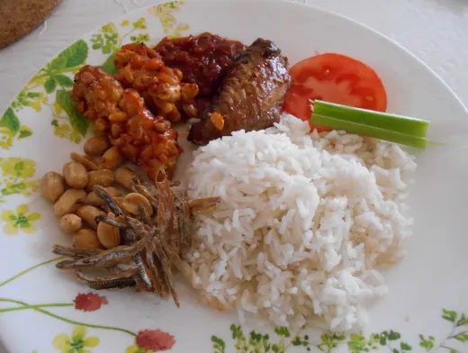 Coconut rice served with tempeh and other ingredients