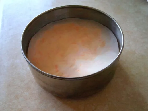 Line the top of batter with baking paper.Pour cake batter into small tin.Cover with foil and place in large pot.Small carrot cake ready to serve, yum!