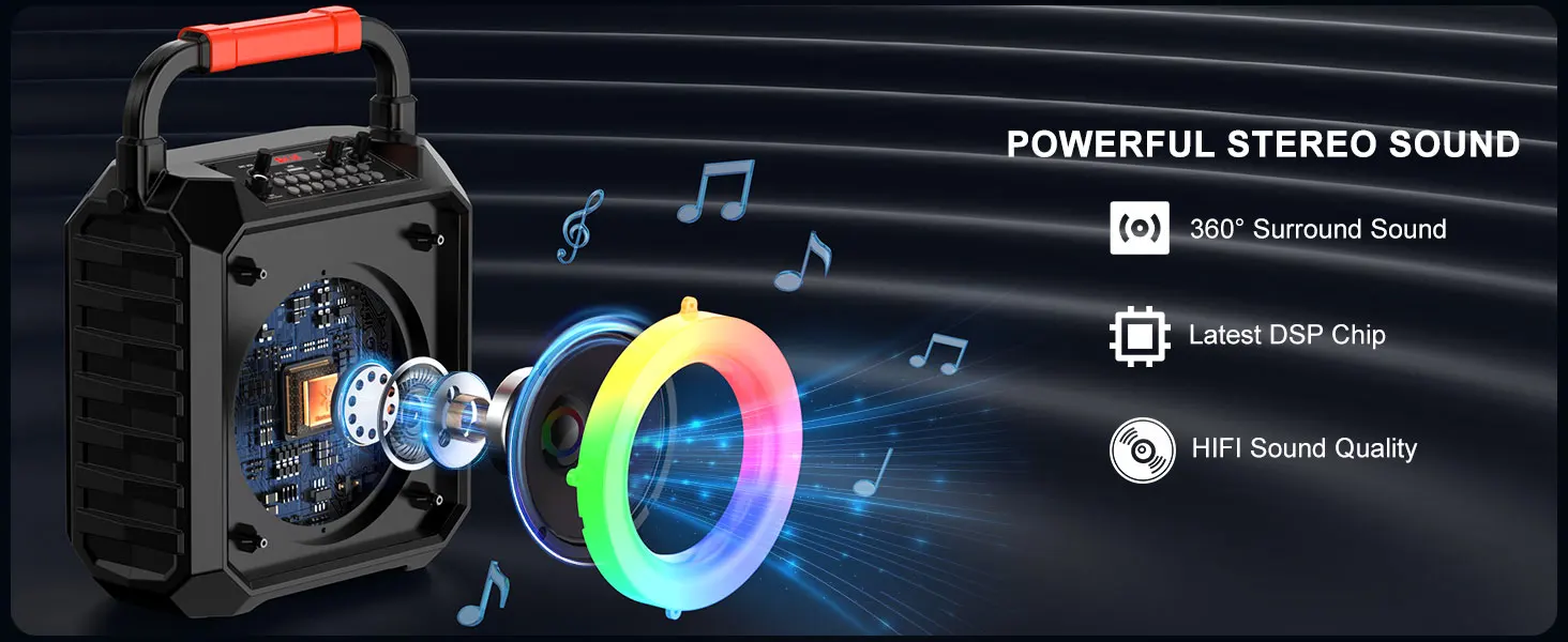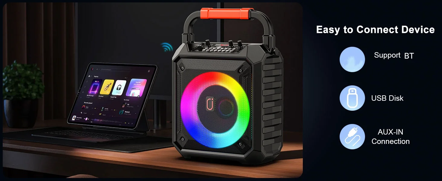 - Colorful Disco Lights: The dazzling LED lights will creat a fun and romantic karaoke and party atmosphere. With colorful adjustable LED lighting patterns sync with music, creating a captivating stage effect and party atmosphere. Lets bring out the singer in you with this karaoke party system!