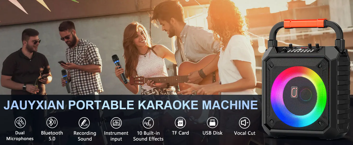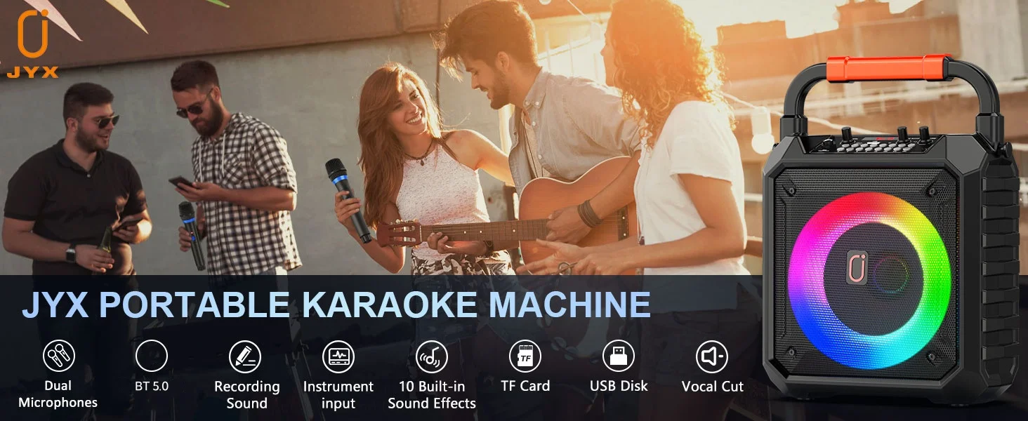 - ALL-in-One Karaoke Machine: Our JYX Karaoke machine equipped with 2 wireless karaoke microphones, easy volume control, and flashing LED lights. It’s suitable for all ages and guarantees hours of fun and entertainment. Perfect for parties, family karaoke, weddings, gatherings outdoor/indoor activities.