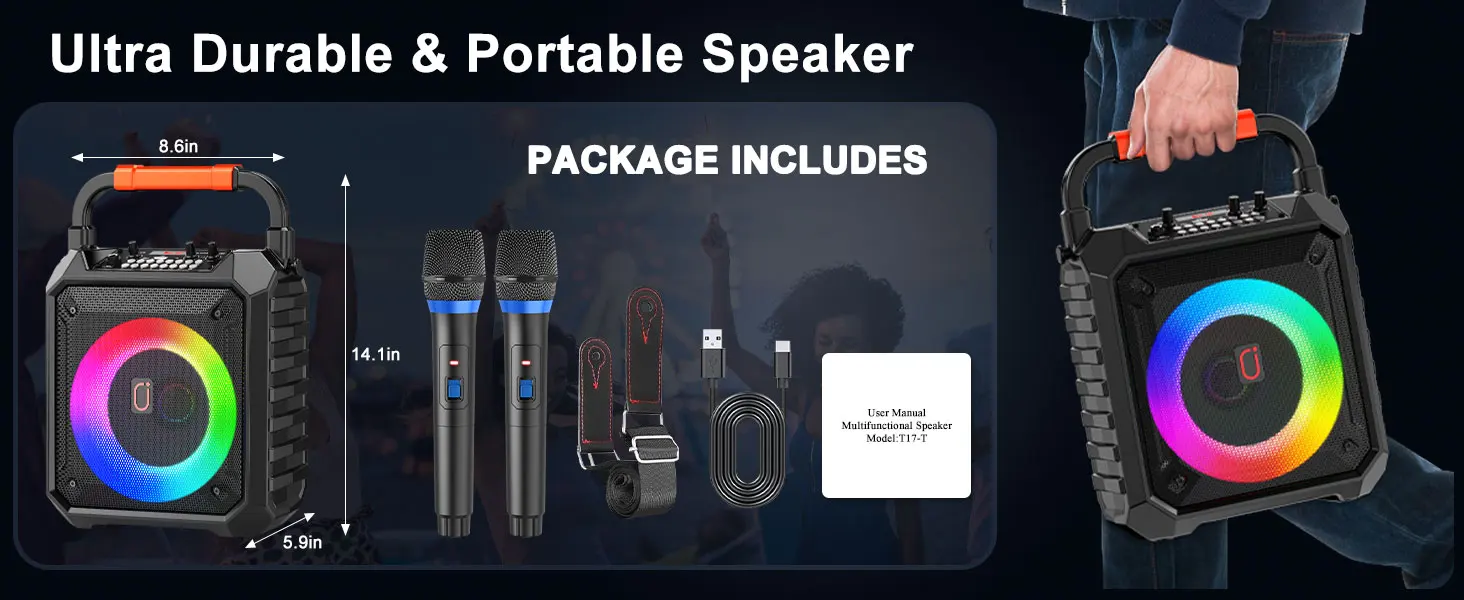 T17-T/T19-T Karaoke Machine with 2 Wireless Microphones, Portable Speaker with LED Lights for Kids and Adults, Supports Bluetooth/USB/TF/AUX